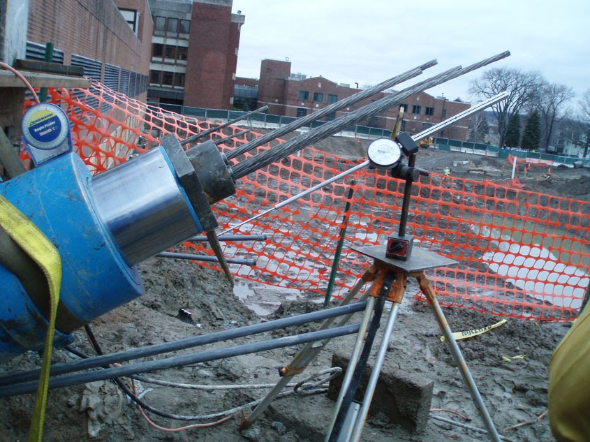 Tiebacks are used to provide the lateral resisting force for many of the excavation support systems and anchored retaining walls that Schnabel builds. They are constructed by grouting a high strength steel bar or strand bundle into the soil or rock behind the failure surface of the retaining wall. After the grout has cured, every tieback is tested, and the load is locked in to limit movement.