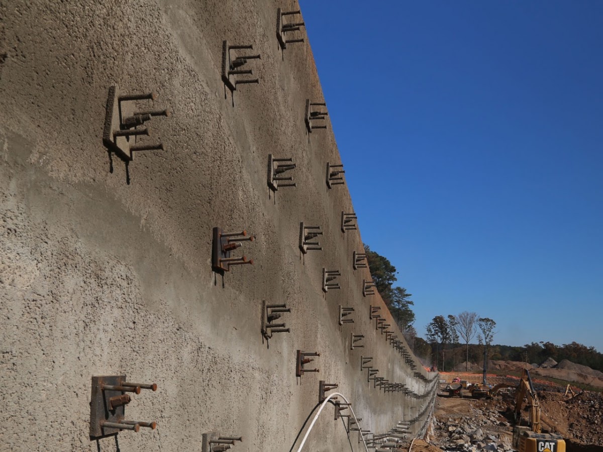 Soil nailing is an in-place reinforcement of the existing soil/rock at a site that utilizes steel tendons grouted into drilled holes to create a stable block. Shotcrete, reinforced with wire mesh and/or reinforcing steel, is applied to the face of the excavation to secure the soil between the nails. Soil nailing is installed from the top down as an excavation is made in 4 to 6-foot lifts.